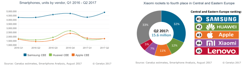 El fabricante destacado en el trimestre fue Xiaomi, que subió al cuarto lugar, a pesar de estar active en la región durante solo un año. Mandó 1.1 millones de dispositivos a la región de Europa central y oriental en el Q2 para lograr una cuota de mercado de 7%. Encontró mayor éxito con su familia Redmi orientada al costo, debido a que los mercados en la región siguen siendo extremadamente conscientes del precio. El Redmi 4A fue su producto más vendido, con más de 350,000 unidades despachadas en el Q2.
