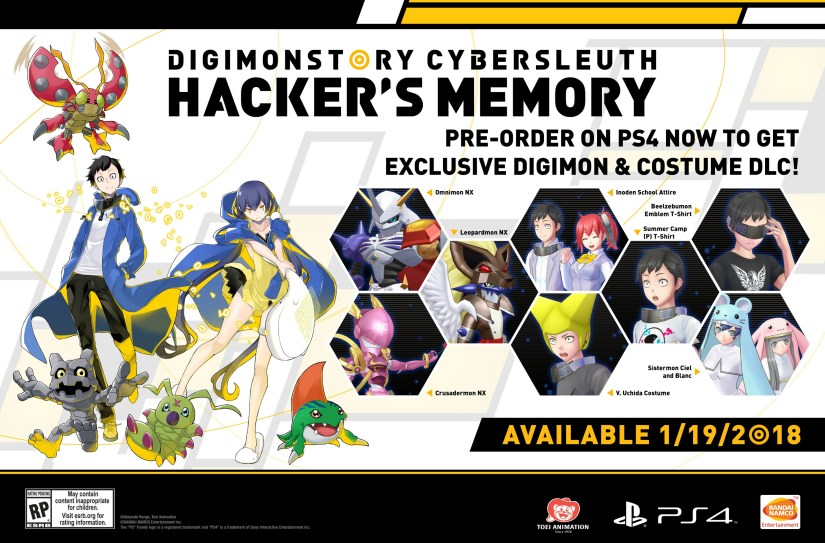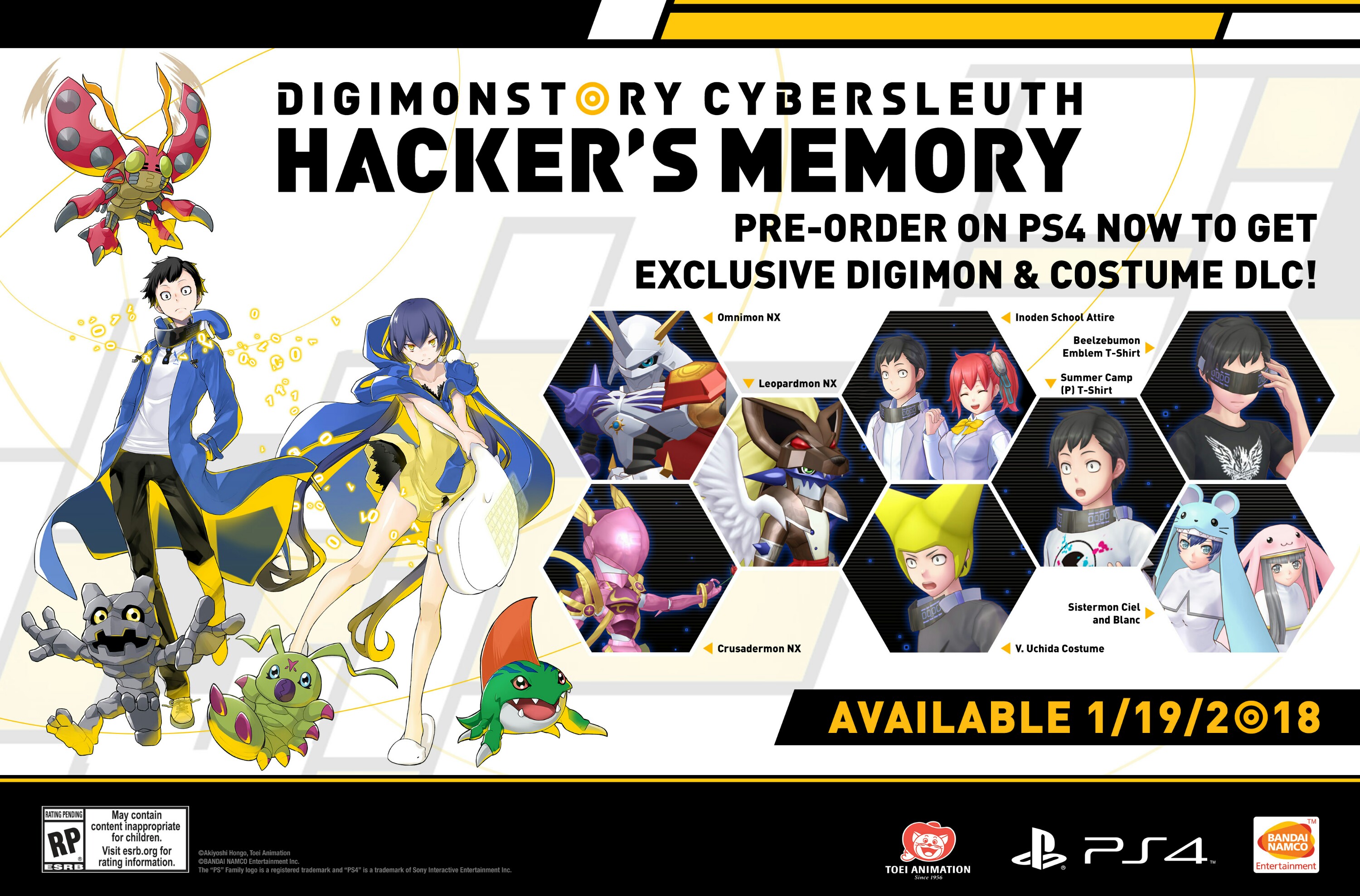 Digimon Story Cyber Sleuth Hacker’s Memory estará disponible a partir del 19 de enero 2018 para PlayStation4 y ya puedes apartarlo a través de tiendas participantes y la PlayStation Store segurando cuatro Digimon distintos y cuatro trajes para tu personaje.