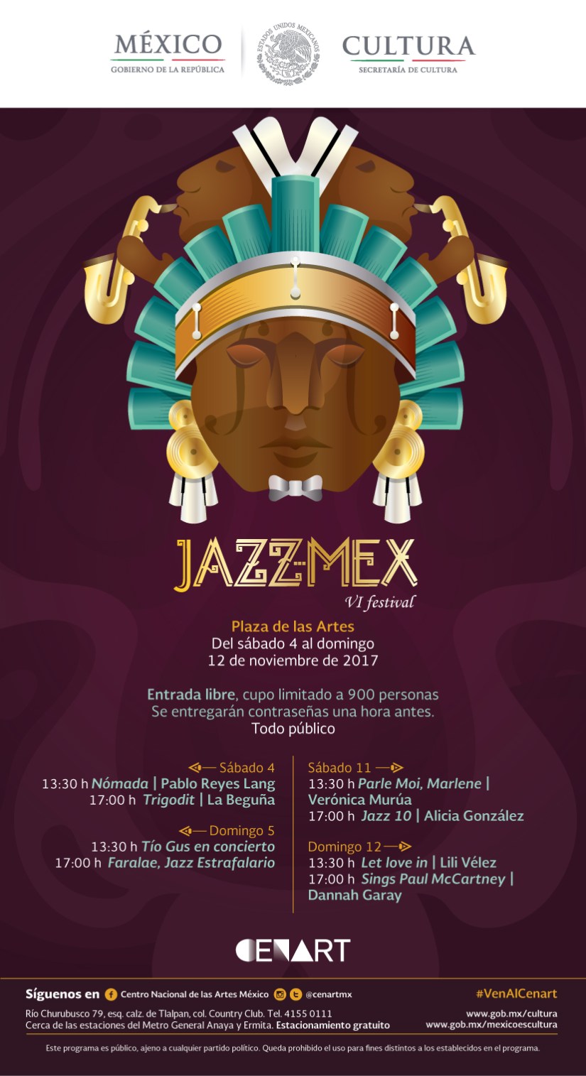 El Centro Nacional de las Artes (Cenart) nuevamente abre sus puertas al jazz para recibir a diversas propuestas que la escena musical mexicana ofrece a los amantes del género sincopado, con el VI Festival Jazz-Mex, que del 4 al 12 de noviembre ofrecerá ocho conciertos de entrada libre en la Plaza de las Artes.
