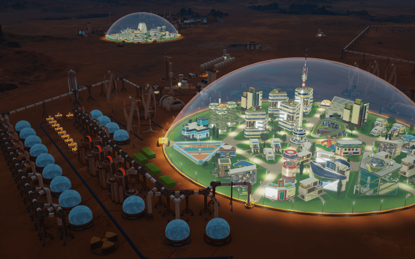- Domos espaciales futurísticos: Super-estructuras retro-futurísticas albergan a las colonias, las fábricas y los edificios comerciales con sus propias “personalidades”. Construye colonias que valoran la ciencia más que cualquier otra cosa, mientras que cansados trabajadores beben en el bar o sueñan utopías con las estrellas.