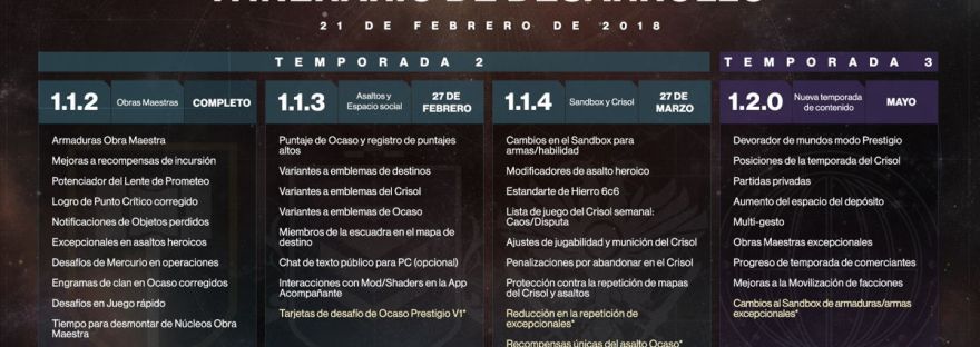 Hace algunas semanas te compartimos el Itinerario de Desarrollo de Destiny 2 a fin de darte un adelanto de los cambios en los que estamos trabajando. Tal como lo hemos estado mencionando, este itinerario es nuestra estimación más actual y haremos todo lo posible por mantenerte al tanto de nuestros planes según se vayan trazando.