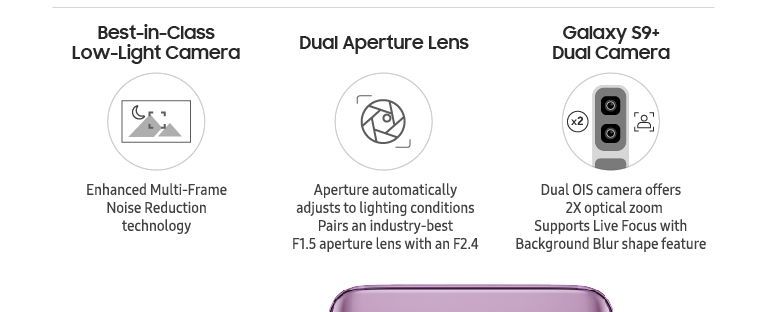 La cámara dual premium de Galaxy S9+ está compuesta por un par de cámaras de 12MP –una lente de gran angular F1.5 con sensor de imagen Super Speed Dual Pixel y una lente con teleobjetivo F2.4 que combinan las imágenes en una sola.