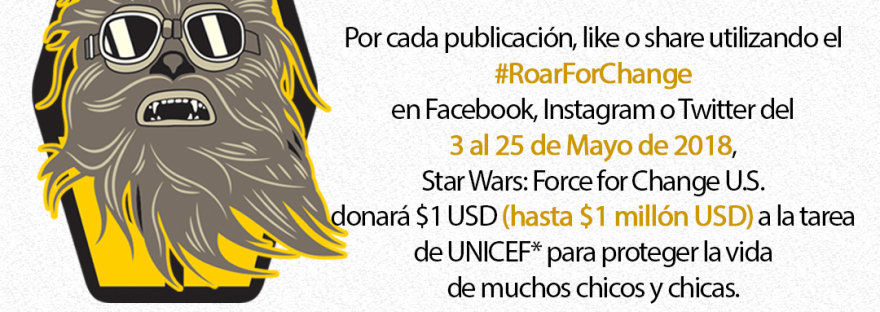 Lucasfilm y Star Wars: Force for Change anunciaron hoy la iniciativa Roar For Change (Rugir por el cambio), un desafío global en apoyo a los programas globales de nutrición de UNICEF. La misma invita al público a compartir su propia versión del icónico rugido de Chewbacca. Por cada publicación, like o share utilizando el #RoarForChange en una cuenta abierta de Facebook, Instagram o Twitter, entre el 3 y el 25 de mayo de 2018, Star Wars: Force for Change de los EE. UU. donará 1 dólar a UNICEF, hasta alcanzar 1 millón de dólares. Los fondos se utilizarán para apoyar el trabajo de UNICEF que salva la vida de niños de todo el mundo. Chewbacca es el protagonista de HAN SOLO: UNA HISTORIA DE STAR WARS, la nueva película de Lucasfilm que estrenará en cines el 25 de mayo, y cuya preventa de entradas comienza mañana, 4 de mayo, en https://app.powster.com/disney/solo-a-star-wars-story/lam/