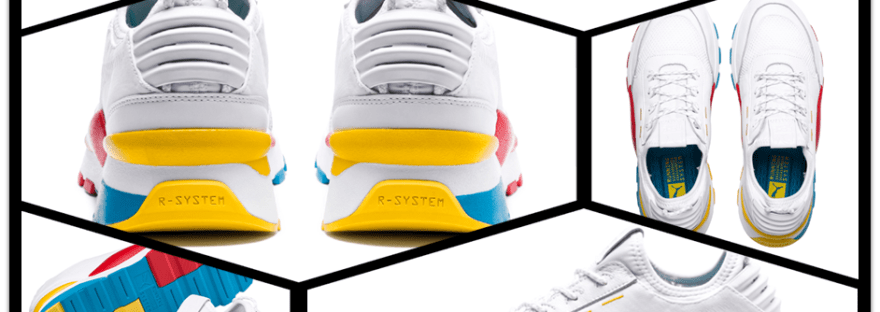 Inspirado en los videojuegos de los años 80; este diseño juega con los colores y detalles translúcidos. La clave del estilo está en la soberbia de los colores, junto con la parte superior de cuero color blanco, acompañado de pequeñas perforaciones y un relieve en forma de tira. Toques en rojo y amarillo, inspirados en los botones de las consolas, conforman la parte de la entresuela, mientras que la suela cuenta con un diseño moderno de bloqueo de color. Los logotipos R.System se encuentran ubicados en la lengüeta y en la suela.