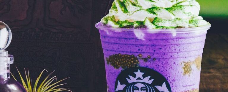 Esta mágica bebida es un Frappuccino Cream que comienza con una mezcla púrpura de «aliento de sapo» sabor a naranja y un remolino de «verrugas de murciélago» verdes, hechas con semillas de chía. Una cubierta de crema batida de vainilla y un espolvoreo verde de «lagarto» como topping terminan por darle el toque final a esta bebida.