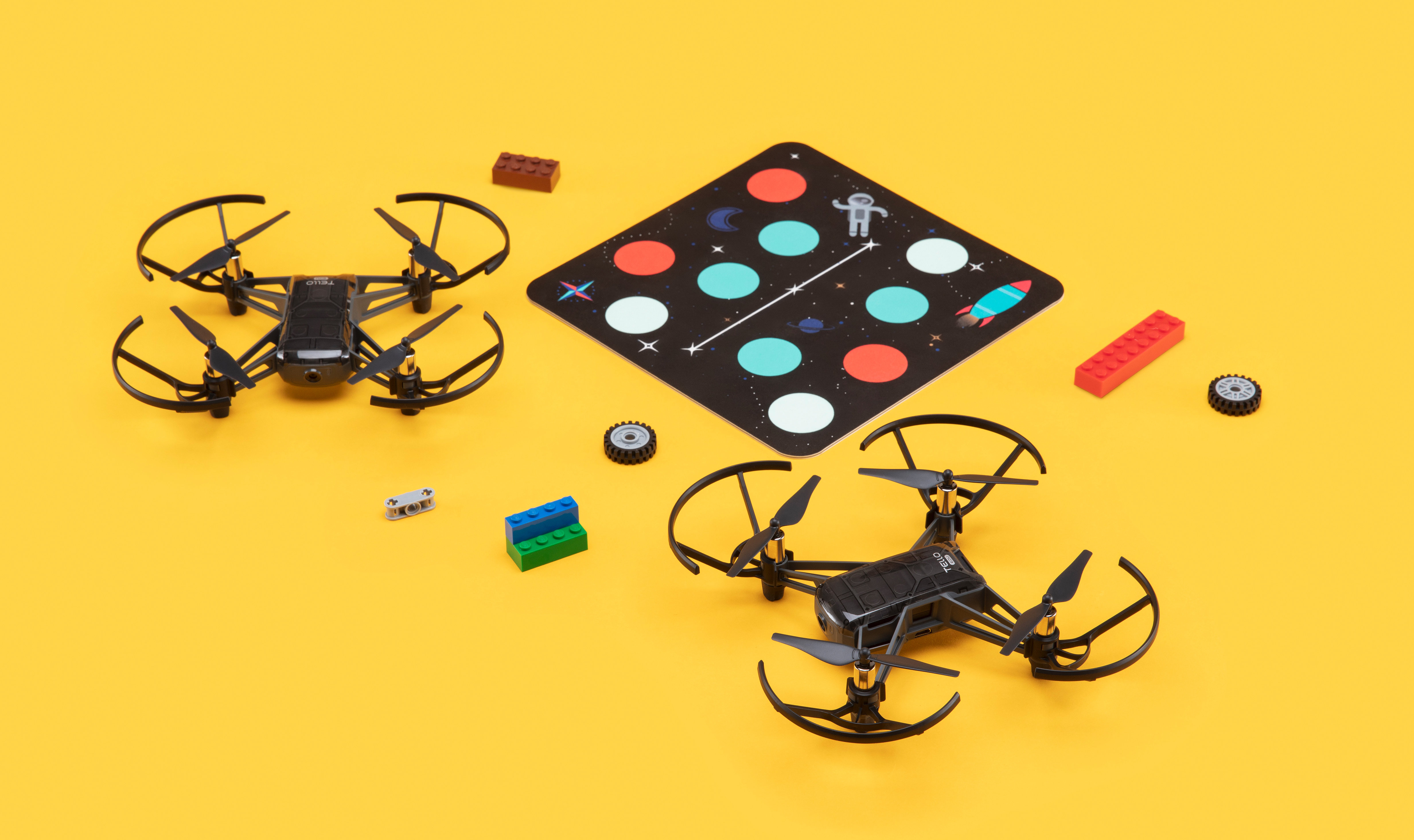 Tello EDU incluye cuatro bases para misiones, que consisten en accesorios de colores que proporciona una experiencia de programación más completa. Los usuarios pueden hacer que Tello EDU reconozca su posición en función de las bases, así como la respuesta específica que debe tener según esta posición.