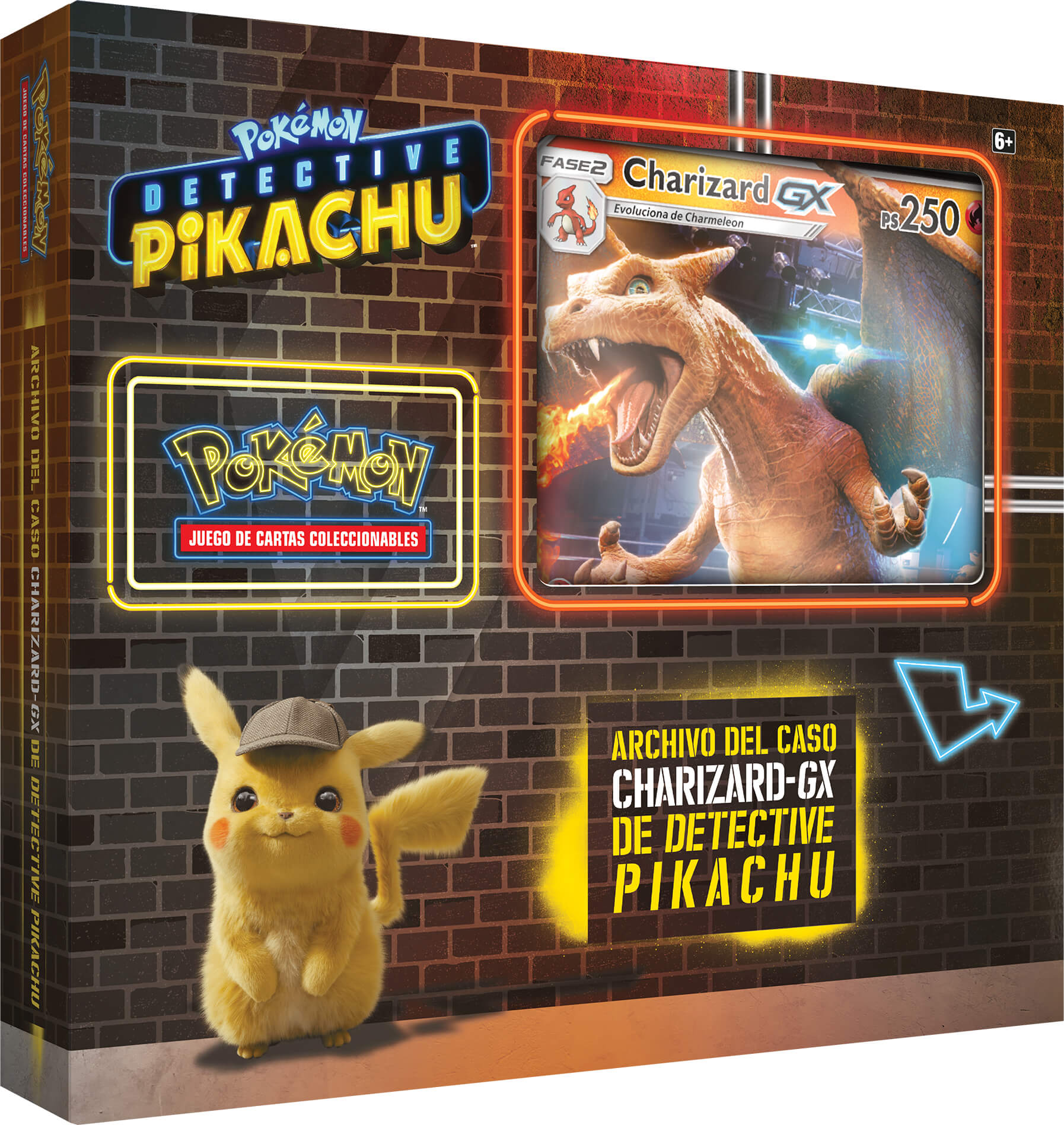 - Contiene: Una carta holográfica de promoción y una carta holográfica de gran tamaño de Charizard-GX, cuatro paquetes de mejora de Detective Pikachu, dos paquetes de mejora adicionales de JCC Pokémon y una carta con código para el Juego de Cartas Coleccionables Pokémon Online.