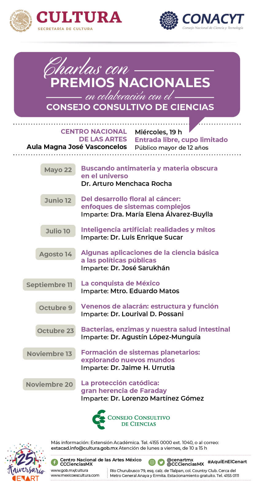 El miércoles 22 de mayo inicia la segunda edición del ciclo Charlas con los Premios Nacionales, una colaboración entre el Consejo Consultivo de Ciencias de la Presidencia de la República y el Centro Nacional de las Artes (Cenart) que tiene el objetivo de incentivar la discusión de ideas en áreas como la Física, Química, Matemáticas, Ciencias Sociales, Filosofía, Historia, Tecnología y Diseño.