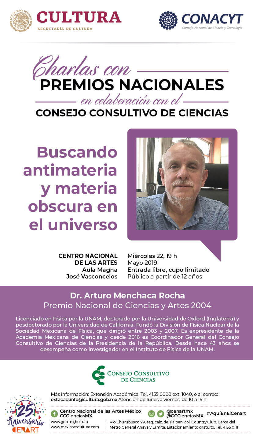Las Charlas con Premios Nacionales inician en el Cenart el miércoles 22 de mayo, a las 19:00 h, con la participación del Dr. Arturo Menchaca Rocha, quien impartirá la conferencia titulada “Buscando antimateria y materia obscura en el universo”.