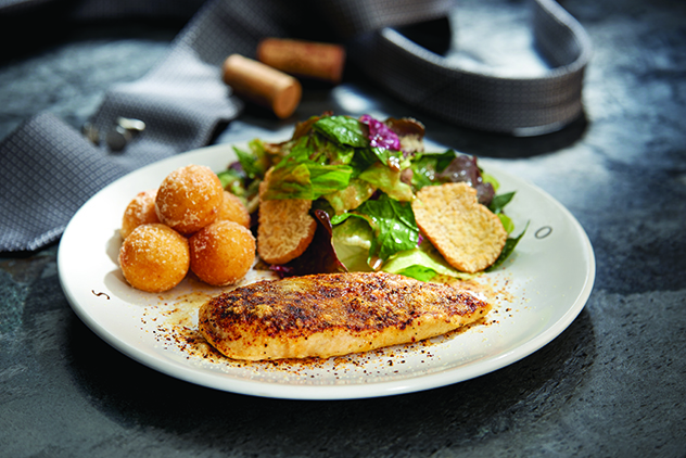 Pechuga de costra de parmesano y morita. Tierna pechuga de pollo envuelta en una costra de queso parmesano doradita, acompañada de papas avellana y ensalada de frescas lechugas con espinacas al balsámico. Un platillo tan especial que hará pedir más a cualquiera.