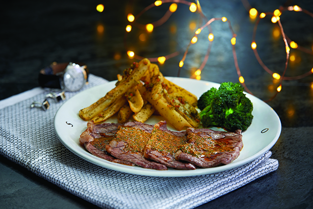 Jugosa Picaña con salsa a las finas hierbas y pasilla, acompañadas de crujientes papas al chimichurri y brócoli dorado. Un platillo ideal para los papás amantes de la carne.