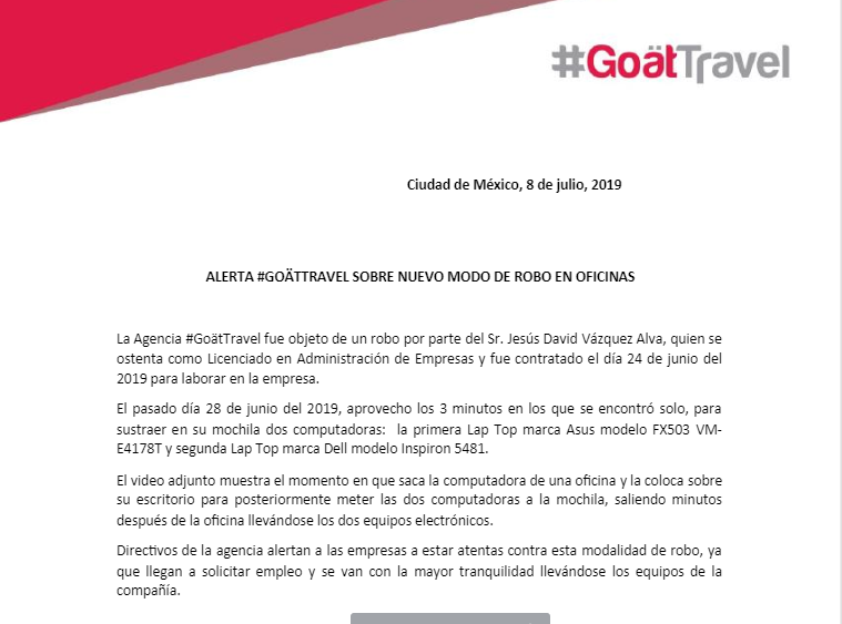 La Agencia #GoätTravel fue objeto de un robo por parte del Sr. Jesús David Vázquez Alva, quien se ostenta como Licenciado en Administración de Empresas y fue contratado el día 24 de junio del 2019 para laborar en la empresa.