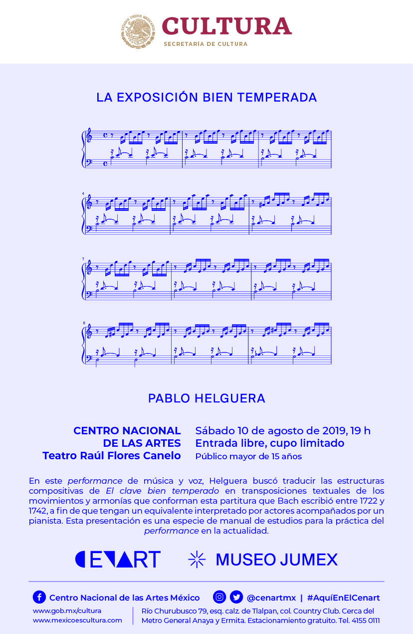 El proyecto de Pablo Helguera La exposición bien temperada, se presentará por única ocasión el sábado 10 de agosto, en el Teatro Raúl Flores Canelo del Centro Nacional de las Artes (Cenart), como parte de su exposición antológica Dramatis Personæ.