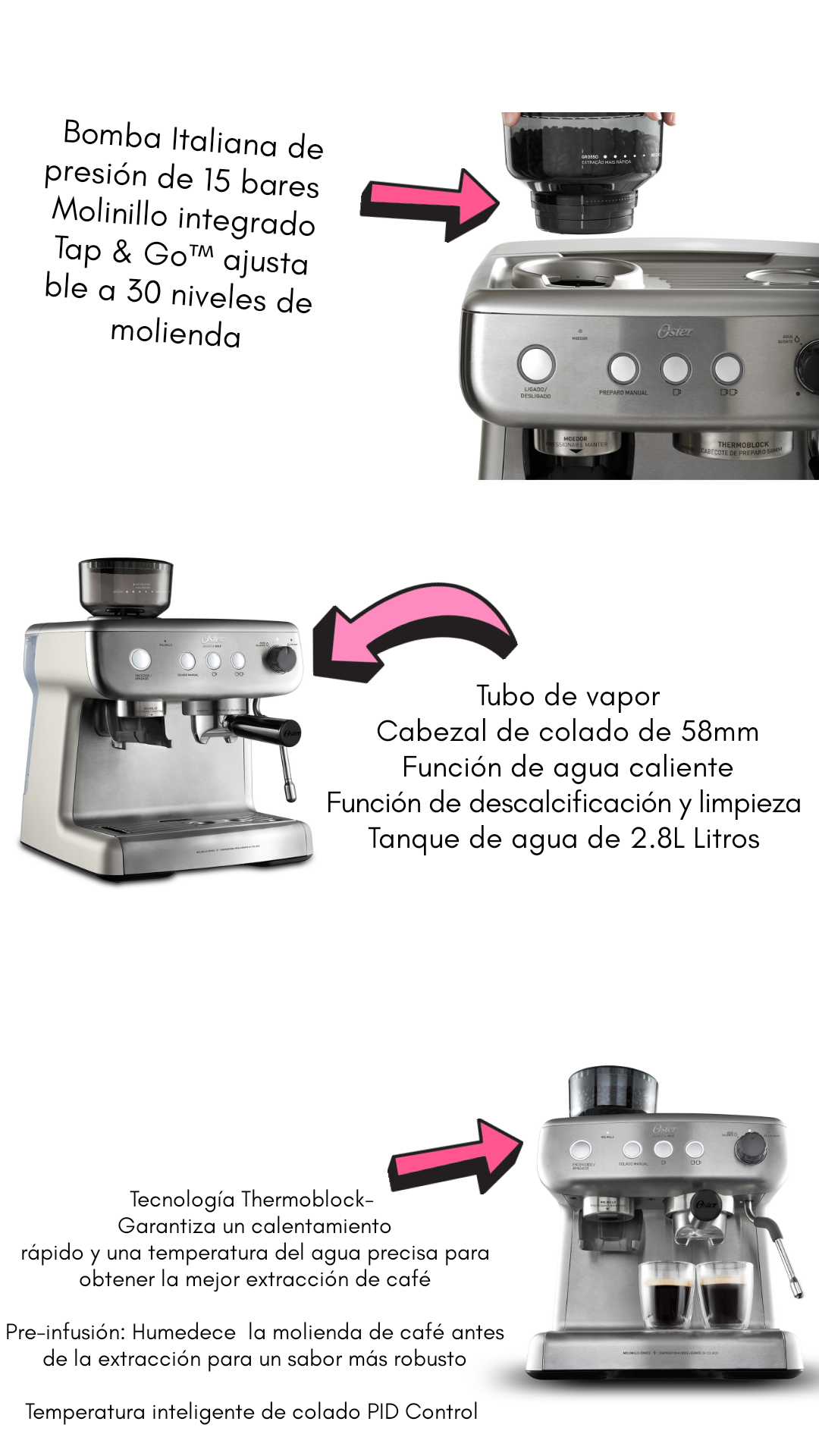 Durante la presentación se destacaron las cualidades de la nueva cafetera Perfect Brew, que cuenta con dos tecnologías exclusivas, el molinillo incorporado Tap & Go™ que permite una experiencia de molido fácil y ajustable a 30 niveles de molienda, que maximizará el sabor del café, así como un sistema de tres vías que incluye: una bomba italiana de 15 bares, tecnología thermoblock y pre- infusión, que trabajan juntos para regular y estabilizar la temperatura del agua, logrando la temperatura precisa para un café de excelente sabor y textura. Incluye un potente tubo de vapor para espumar la leche. La cafetera Oster® Perfect Brew utiliza un cabezal de colado grande de 58 mm, que garantiza que el café molido se distribuya de manera uniforme en el filtro, dando como resultado un sabor más fresco.