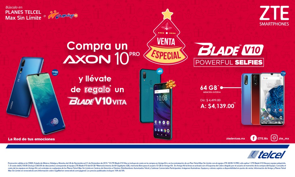 En la compra de un AXON 10 PRO con capacidad de 128 GB de memoria interna y 6 GB de RAM, llévate de regalo un ZTE Blade V10 Vita. El ZTE AXON 10 Pro está equipado con lector de huellas digitales integrado en la pantalla AMOLED de 6.47”, y tres cámaras traseras que te permitirán tomar las mejores fotografías. Su costo en Amigo Kit es a partir de los $12,999.00 pesos. Por su parte el Blade V10 Vita que va de regalo en la compra de esta promoción, tiene una pantalla de 6.26” HD+ con notch en forma de gota de agua, cámara dual trasera 13+2 Mpx, procesador Octa Core a 1.6 GHz y memoria interna de 32GB.