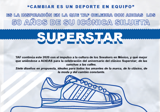 TAF continúa este 2020 con el impulso a la cultura de los Sneakers en México, y qué mejor que uniéndose a ADIDAS para la celebración del aniversario del clásico Superstar; de las canchas a las calles. Siete diseños en propuesta, ideales para todos los amantes de la marca, de lo clásico, de la moda y del cambio constante.