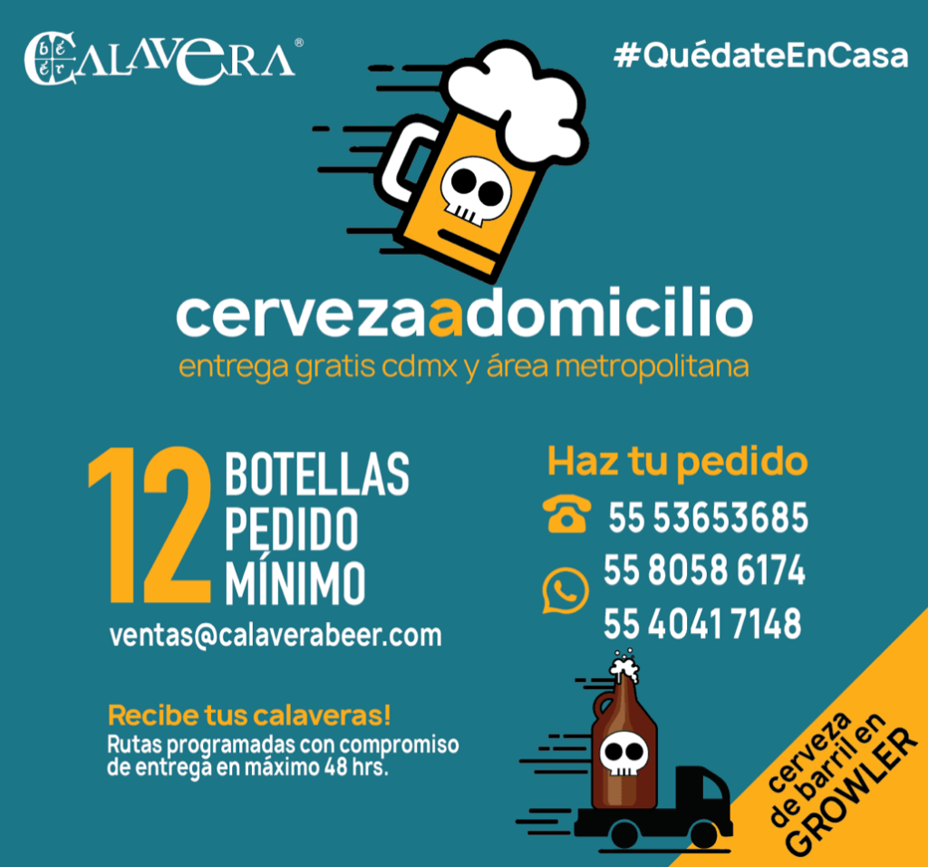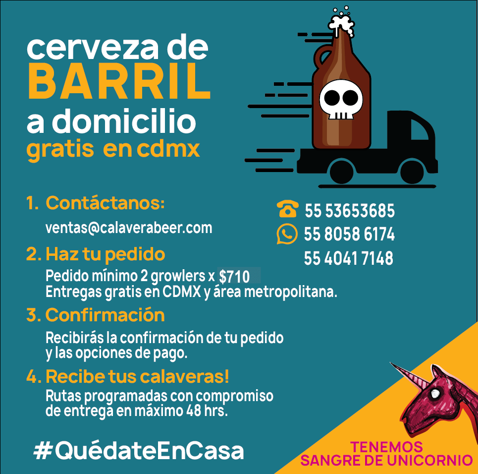 Si vives en CDMX o en el área metropolitana, el envío será gratis cuando pidas cerveza de barril (mínimo 2 growlers) o por botella (mínimo 12). Puedes hacer tus pedidos al 55 5365 3685, o bien al correo ventas@calaverabeer.com