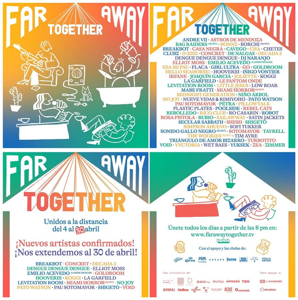 Con el propósito de unirnos a pesar de la distancia, Far Away Together originalmente contempló celebrar un encuentro entre distintos públicos y artistas del 4 al 30 de abril de 2020, a través de su plataforma de streaming: www.farawaytogether.tv