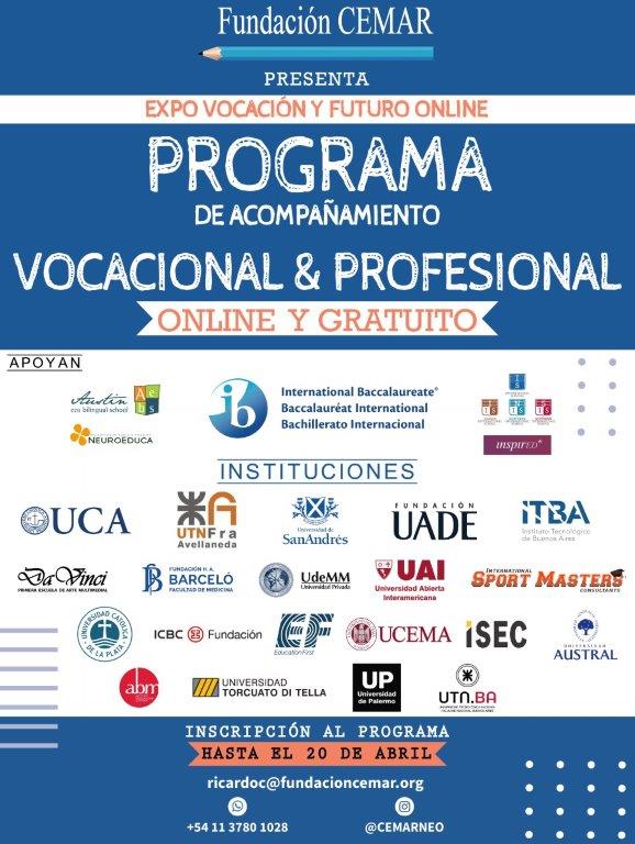 La llegada de la pandemia está fomentando una etapa de cooperación y ayuda, que trasciende a todos. En el ámbito educativo, diversas organizaciones e instituciones de educación superior se unen de forma desinteresada y con la firme convicción de sumar. El Bachillerato Internacional (IB) – organización sin fines de lucro que brinda programas educativos para alumnos de primaria y secundaria – se suma a esta iniciativa y apoya al “Programa de Acompañamiento Vocacional y Profesional” virtual organizado por la Fundación CEMAR, para brindar herramientas a los profesionales del mañana. Los interesados podrán acceder de manera gratuita a contenido digital, charlas, actividades y presentaciones virtuales desde el 20 de abril hasta el 31 de agosto.