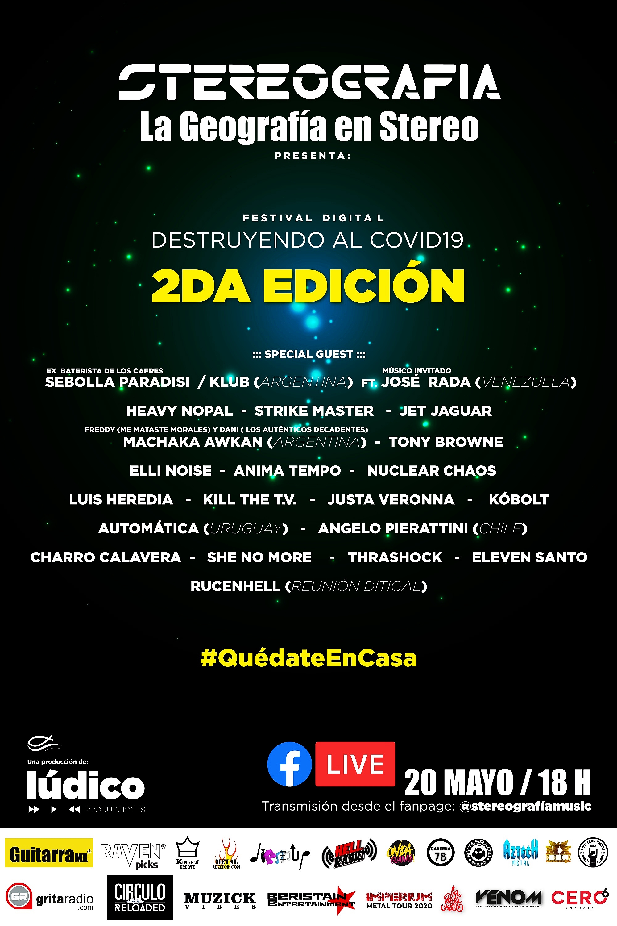 La segunda edición del Festival Digital “Destruyendo al Covid19” se llevará a cabo el Miércoles 20 de Mayo del 2020 a partir de las seis de la tarde y cuya transmisión se hará vía Facebook Live desde https://www.facebook.com/stereografiamusic para que todo mundo pueda tener acceso a él y a sus diversas propuesta