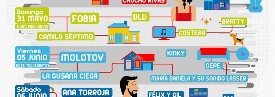 Por primera vez, más de 20 artistas hispanos de rock y pop de primer nivel llenarán los hogares mexicanos con lo mejor de sus respectivos repertorios a través de Internet en dos fines de semana.Cada día, a partir de la 6 de la tarde y hasta las 10 de la noche, se presentarán cinco proyectos musicales con un host diferente, quien amenizará, hará preguntas a los artistas y será el encargado de mantener comunicación en tiempo real con los espectadores y las bandas.