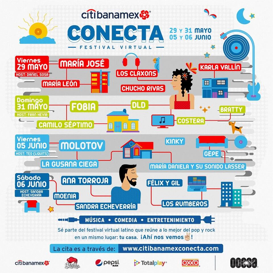 OCESA, y Citibanamex se unen para presentar Citibanamex Conecta, el primer festival de música virtual gratuito que se llevará a cabo los días 29 y 31 de mayo, así como el 5 y 6 de junio a través de la plataforma http://www.citibanamexconecta.com.El periodo de cuarentena por el Covid-19 ha sido un reto para todos, pero también una oportunidad para sacar lo mejor de cada uno y salir adelante. Con Citibanamex Conecta se busca sumar momentos de entretenimiento y convivencia a distancia entre las familias y amigos a través de la música.