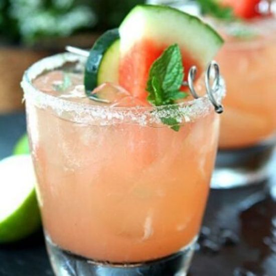 Colocar en un shaker todos los ingredientes (salvo la sandía). Verter la mezcla en un vaso con los cubos de sandía y suficiente hielo; mover despacio para incorporar todos los elementos.