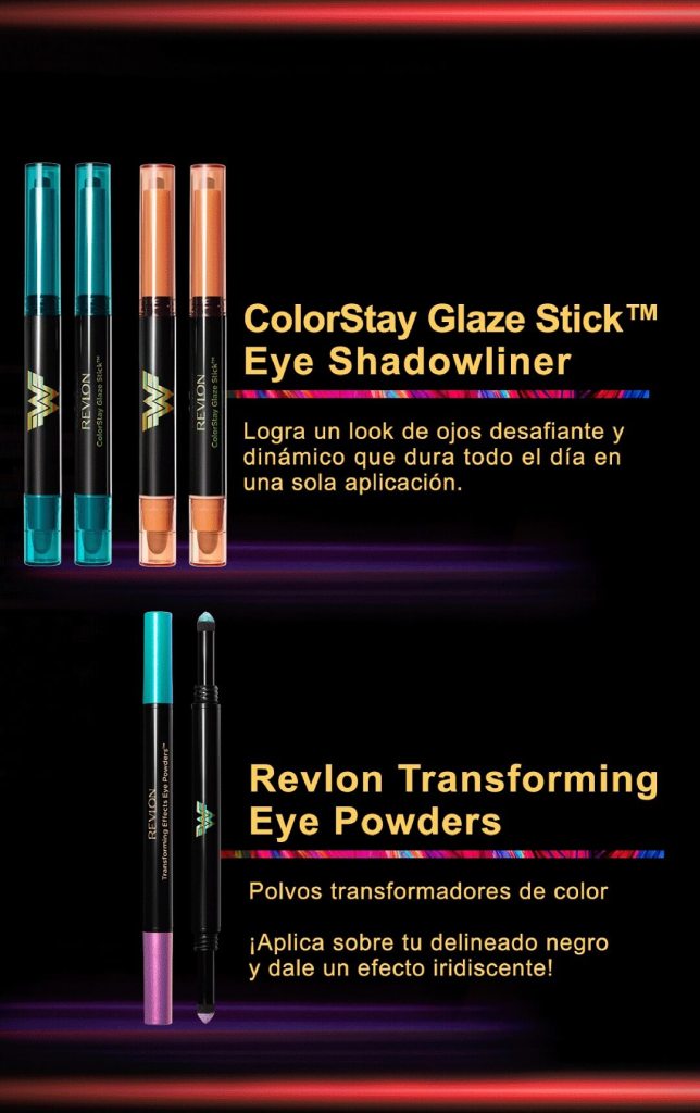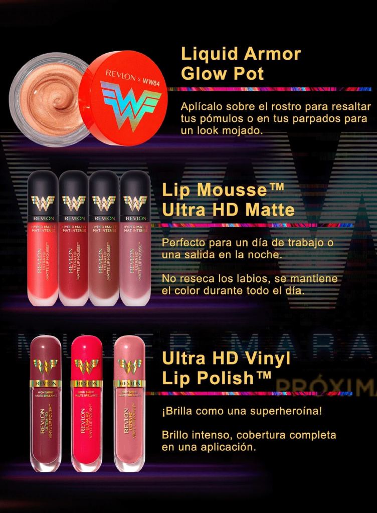 Revlon incluye un espejo comparto con el logo de la heroína para que te maquilles y transformes tu mirada ¿brillante, muy brillante o mate?, ¿Tonos vivos, ahumados o clásicos?, la elección es tuya. La década de los ochentas y el look de la Mujer Maravilla conforman la esencia de la Colección Revlon x WW84. Los productos están disponibles en tiendas de