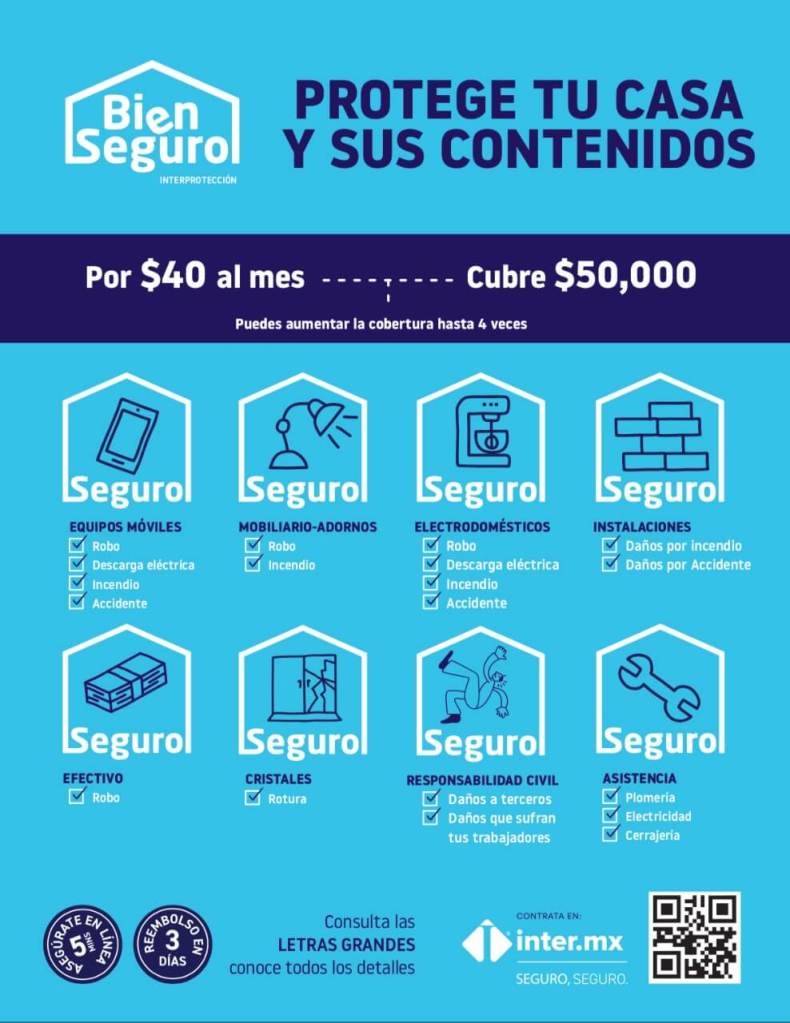 INTERprotección lanza a través de su página web “Bien Seguro”, un producto que ofrece cobertura a Casa-Habitación desde $40.00 pesos mensuales y cubre hasta $50,000.00 para daños en el inmueble o el contenido dentro del hogar. Sin importar si es propia o rentada, protege la vivienda de incendio, robo, descarga eléctrica y equipos móviles, electrodomésticos, mobiliario, adornos, cristales y hasta efectivo.