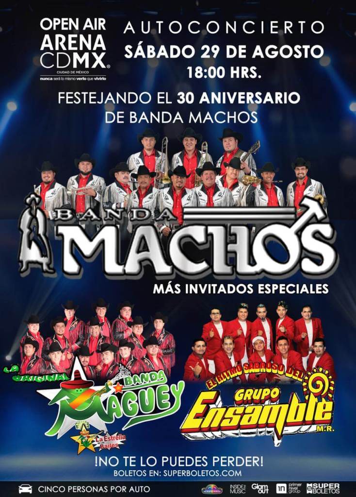 Banda Machos con estrellas invitadas, Original Banda Maguey La Estrella de los Bailes y el Grupo Ensamble se presentan el sábado 29 de Agosto en la Arena CDMX a partir de las seis de la tarde en el formato de Autoconciertos. Boletos a la venta en el Sistema Superboletos.