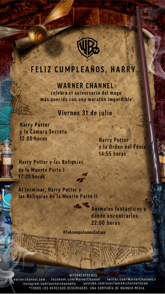 En el mágico mundo de Harry Potter, el famoso mago está de cumpleaños el 31 de julio. Por eso, Warner Channel lo celebra con una maratón llena de magia, conjuros y aventuras en el día de su nuevo aniversario, fecha que además coincide con el nacimiento de la autora de los libros, J.K Rowling. A partir del mediodía del viernes 31 de julio, la fantasía se apodera de la pantalla con el hechicero en su segundo año en Hogwarts, Harry Potter y la Cámara Secreta, luego viene la quinta película, Harry Potter y la Orden del Fénix, seguida de la última parte de la historia con Harry Potter y las Reliquias de la Muerte Parte I y Harry Potter y las Reliquias de la Muerte Parte II. Pero el especial no termina ahí, porque después es el turno de Animales fantásticos y dónde encontrarlos, que tiene de protagonista a Newt Scamander y la participación de un joven Dumbledore.