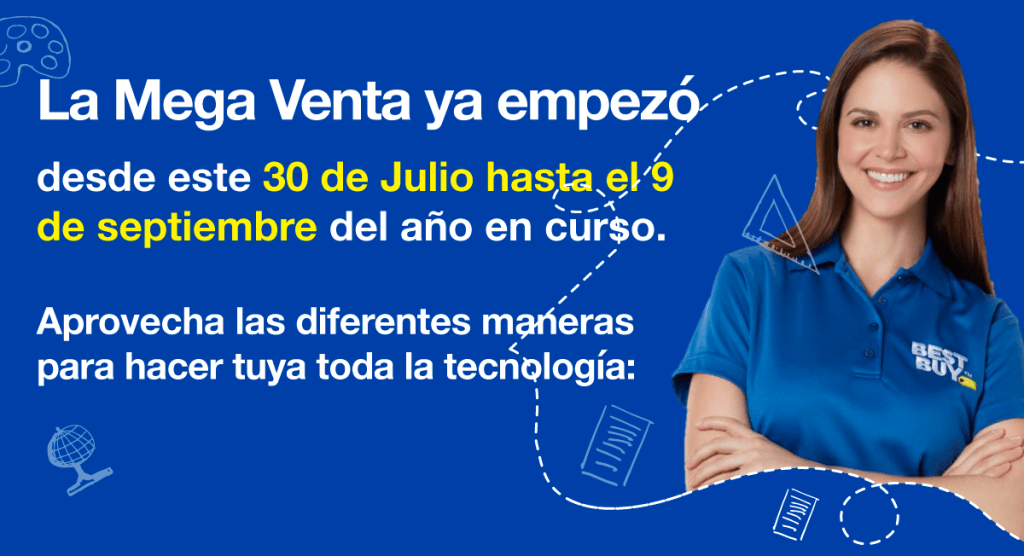La Mega Venta de Best Buy trae la mayor variedad de tecnología en Laptops y desktops, además todo lo que necesitas en accesorios como; fundas y mochilas, audífonos, relojes, cámaras, impresoras y todo lo que se necesita para un regreso a clases ideal; además tendrán descuentos increíbles, cupones de descuento, y lo mejor, mensualidades sin intereses a precio de contado, para que te lleves todo lo que necesitas.