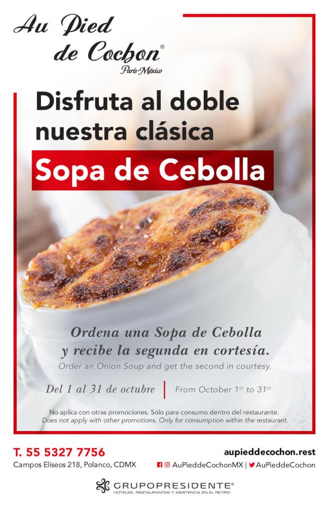 La sopa de cebolla, un platillo originario de Francia y emblemático del restaurante Au Pied de Cochon te invita a disfrutar al doble de su exquisito sabor, ya que, durante todo el mes de octubre al ordenar una, recibirás 2 en tu mesa.