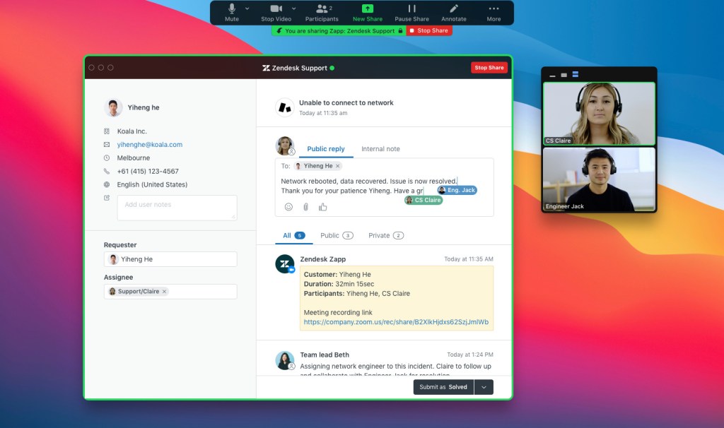 Un ejemplo podría ser, un agente y un cliente se conectan a través de Zoom. En lugar de dejar que Zoom realice un seguimiento en Zendesk Support, el agente puede crear un ticket directamente en una barra lateral con la interfaz de Zendesk que solo el agente puede ver. La experiencia completa de Zoom, incluidas las videoconferencias y el uso compartido de la pantalla, se puede aprovechar para ayudar a facilitar la experiencia.