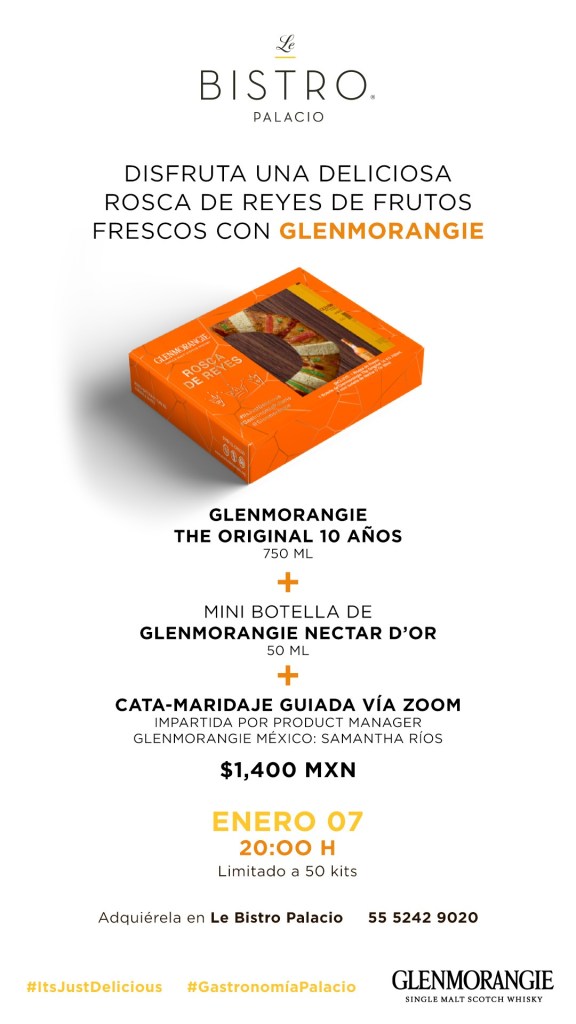 Podrás encontrarla a partir del 01 hasta el 07 de enero 2021, de venta especial en “Le Bistro Palacio”. Recibiendo una cata privada en la compra de una Rosca de Reyes y una botella de “Glenmorangie The Original 10 años” (750 ml); además estarás recibiendo de regalo una botella mini de (50ml), de su etiqueta más dulce: “Glenmorangie Nectar D’Or”,extra – madurado en barricas del famoso vino dulce de Sauternes francés; ideales para acompañar esta rosca la cual contiene cerezas rojas, cerezas verdes, naranja cristalizada combinada con ate verde y rojo; ¡Simplemente deliciosa!