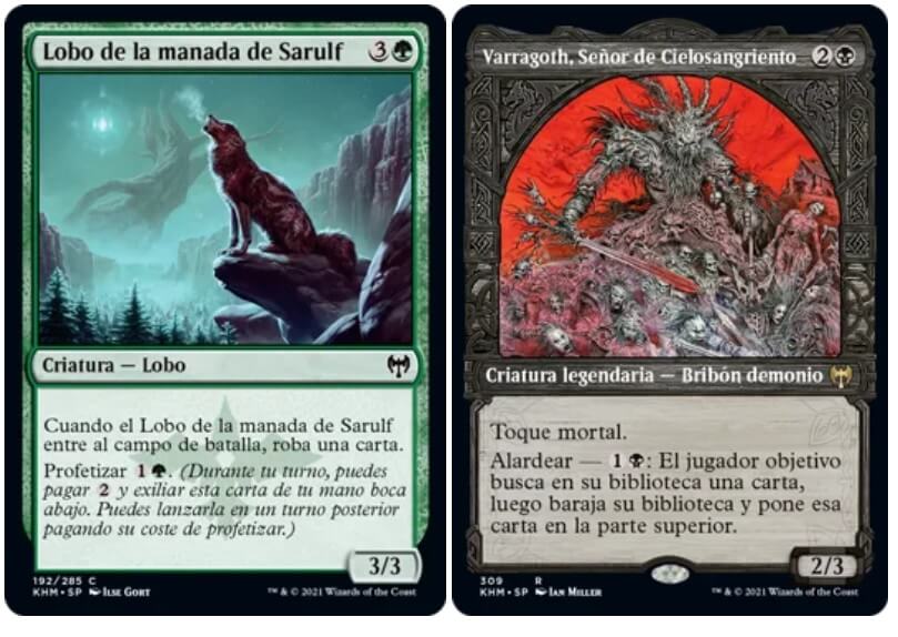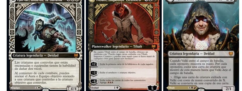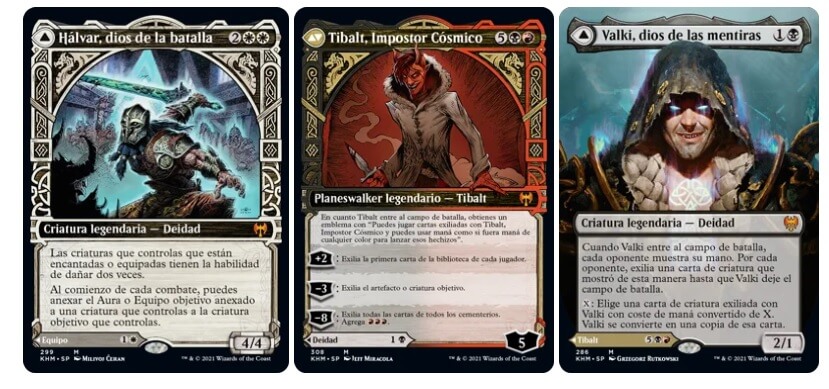 Kaldheim viene con marcos showcase que ofrecen un estilo tallado nunca visto en una carta de Magic. Estos marcos showcase aparecen en la mayoría de las cartas legendarias del set, incluyendo las nuevas cartas mostradas: Halvar, Dios de la Batalla, Tibalt, Impostor Cósmico y Valki, Dios de las Mentiras.