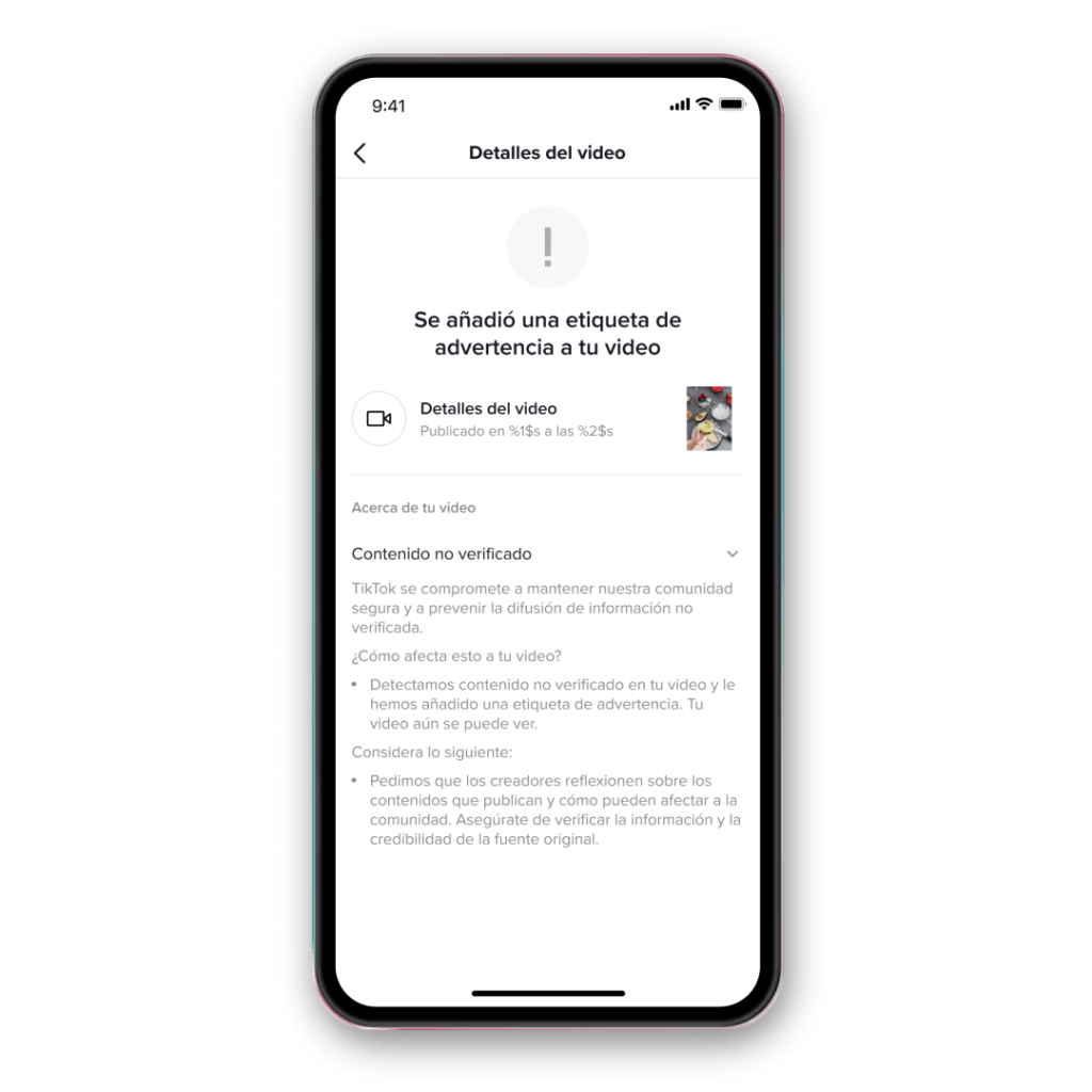 Primero, el usuario verá un banner en el video cuando este haya sido revisado, pero no pueda ser validado por completo.