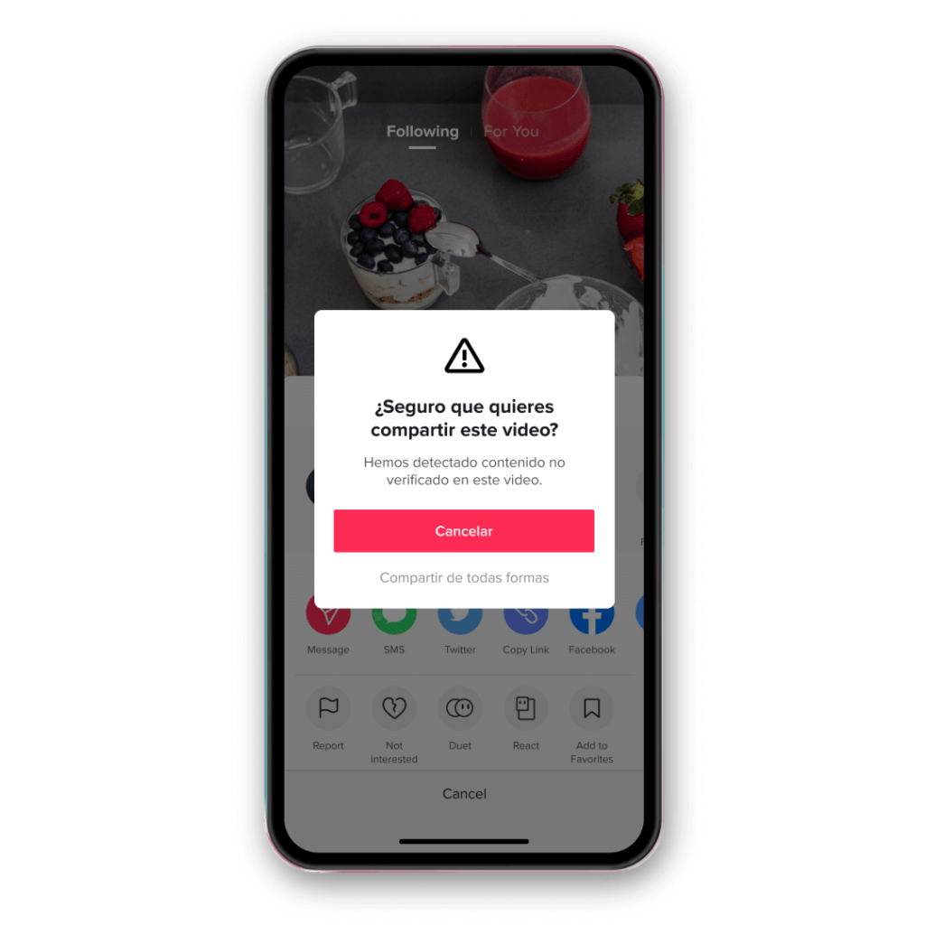 Si el usuario intenta compartir este video, verá un mensaje informativo que le recordará que se trata de un contenido marcado como ‘No verificado’. Este paso adicional fue agregado con el fin de que el usuario haga una pausa y elija su próximo movimiento, ya sea ‘Cancelar’ o ‘Compartir de todas formas’.