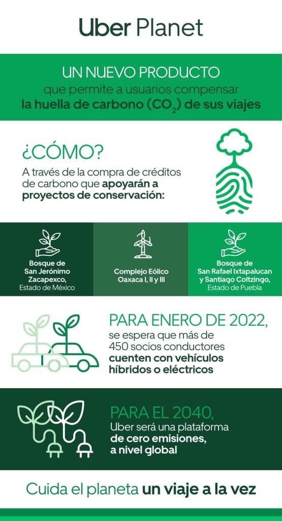 Asimismo, este nuevo producto incluye programas y alianzas para alentar a los socios conductores a cambiar su vehículo por uno híbrido o eléctrico, para que de esta manera no nada más se compense la huella de carbono, sino, que la misma se reduzca a cero. Para enero de 2022, se espera que más de 450 socios conductores puedan sustituir sus vehículos por estos modelos ecológicos y amigables al medio ambiente.