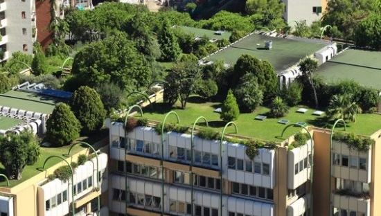 Gestión de aguas pluviales: Con los techos verdes, el agua es almacenada por el sustrato y luego absorbida por las plantas desde donde es devuelta a la atmósfera a través de la transpiración y evaporación. En época de lluvias, los techos verdes pueden retener entre el 70 y el 90% de la precipitación que cae sobre ellos.