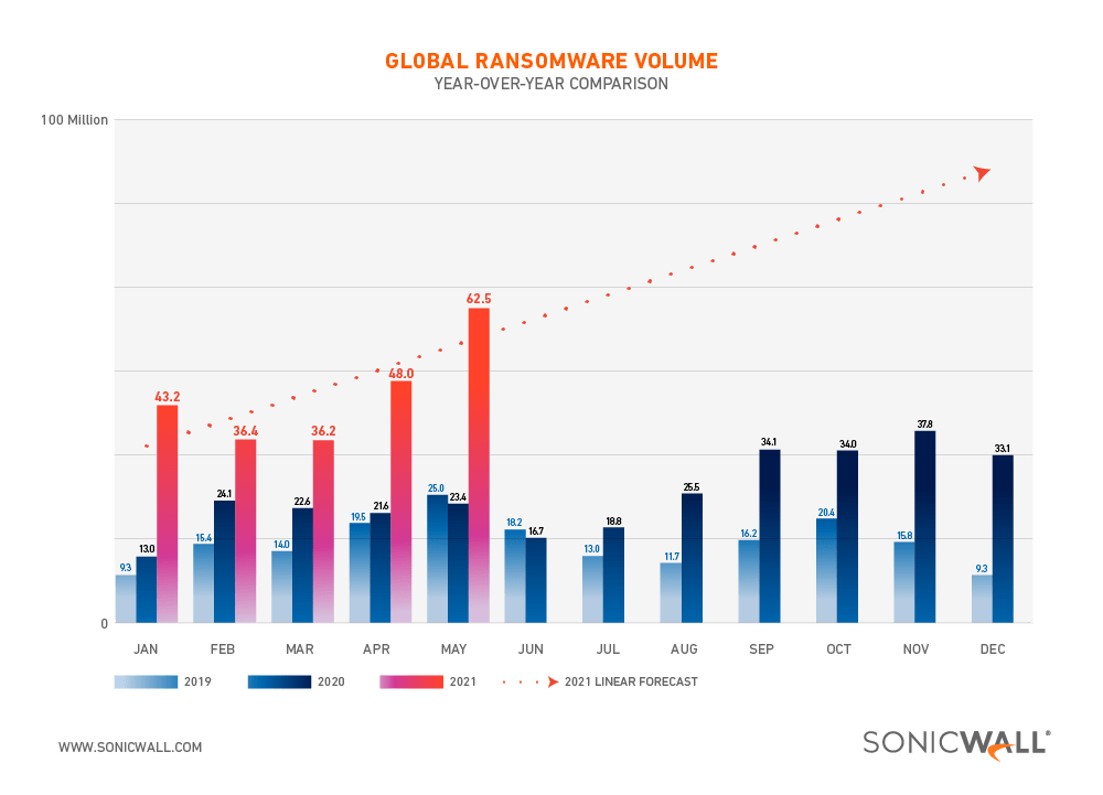 Los investigadores de SonicWall en su continuo monitoreo de la actividad de los ataques cibernéticos, registraron durante mayo de 2021 la mayor cantidad de ataques de ransomware suscitada en la primera mitad del año, 62.3 millones de ataques perpetrados a nivel global, 14 millones más que los identificados durante abril.