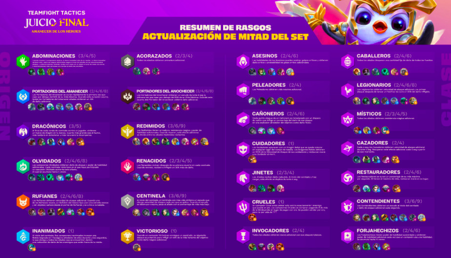 La versión 11.15 de Teamfight Tactics ya está disponible. Y aquí, Riot Games presenta una hoja de referencia rápida con la alineación actualizada de Amanecer de los Héroes: