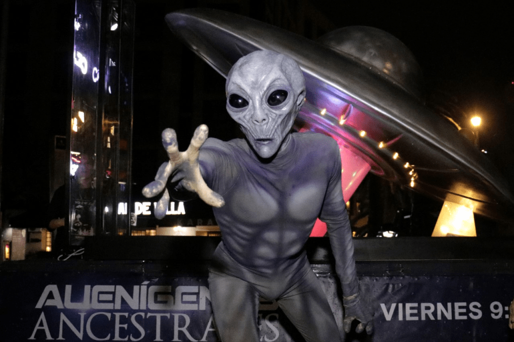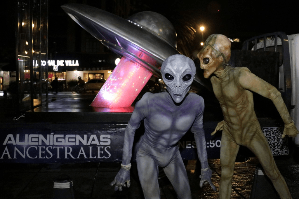 Una plataforma móvil transportó en las principales avenidas de la Ciudad de México una nave extraterrestre de la cual descendían dos alienígenas, causando sorpresa y emoción a los habitantes mexicanos.