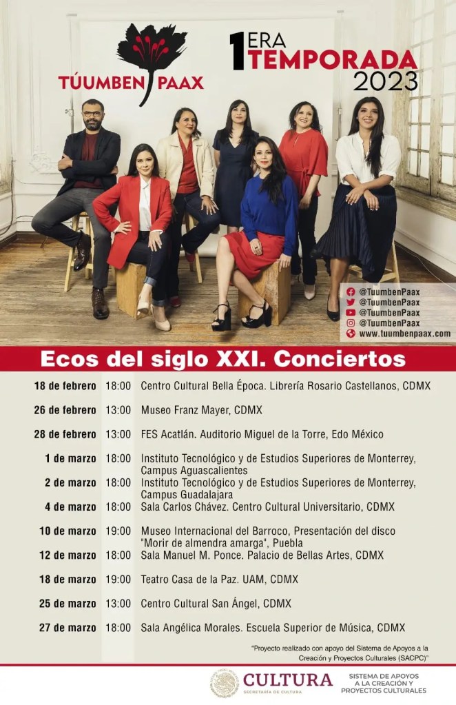 El sexteto Túumben Paax, asociación femenina con más de 17 años de trayectoria impulsando y fomentando la difusión de la música contemporánea, esencialmente la mexicana presentará el espectáculo musical Ecos del siglo XXI, a partir del 18 de febrero y hasta el 18 de marzo en CDMX, Guadalajara, Aguascalientes y Puebla, presentandóse en escenarios como el Museo Franz Mayer, la Sala Carlos Chávez, Tecnológico de Monterrey, Sala Manuel M. Ponce del Palacio de Bellas Artes, el Centro Cultural San Ángel, el teatro Casa de la Paz y la Escuela Superior de Música, entre otras, para interpretar piezas escritas para este ensamble vocal.